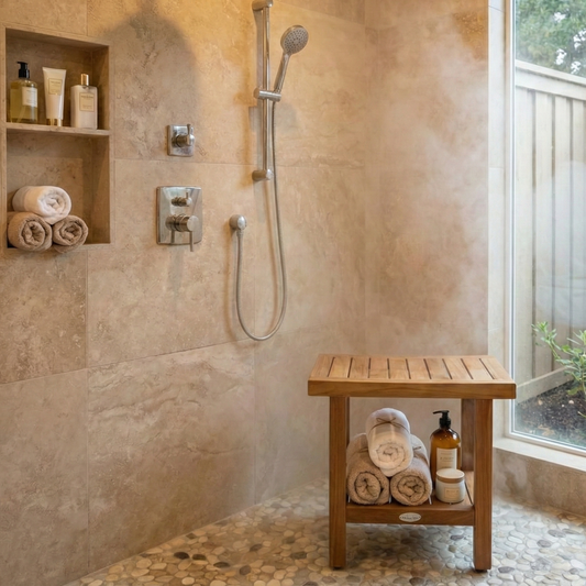 Adjustable-Length Acacia Shower Bench with Storage Shelf | Waterproof Bath Stool