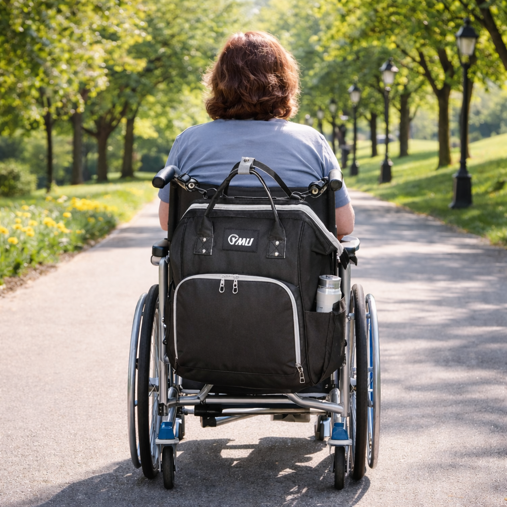 Carrying items while using a wheelchair or mobility aid can affect balance, posture, and energy levels. A rear-mounted storage bag helps redistribute weight, reduce upper-body strain, and support safer, more efficient movement. Organized compartments also reduce the need for repeated reaching or twisting, which can be especially helpful during longer outings.
